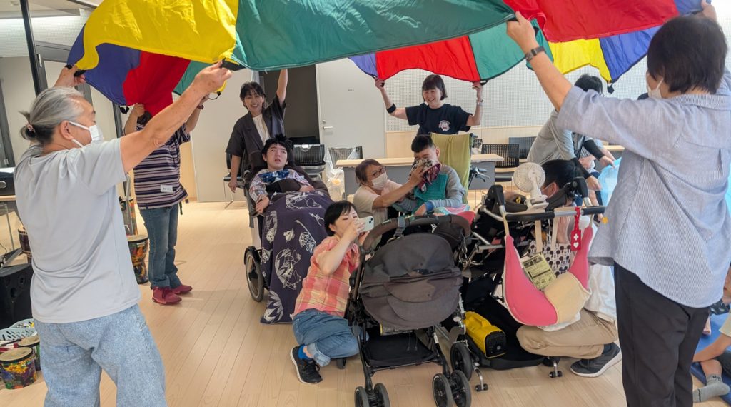その後は、音楽療法士の先生お二人を講師にお迎えし、音楽を通じた楽しいプログラムがスタート。懐かしい歌をみんなで口ずさみながら、マラカスや鳴子を手にリズムをとったり、カラフルなバルーンを協力して膨らませたりと、笑顔と笑い声が絶えない時間となりました。大きな太鼓の音が響くと、子どもたちも大人も目を輝かせ、音楽の力で心がひとつになる瞬間が何度も訪れました。
